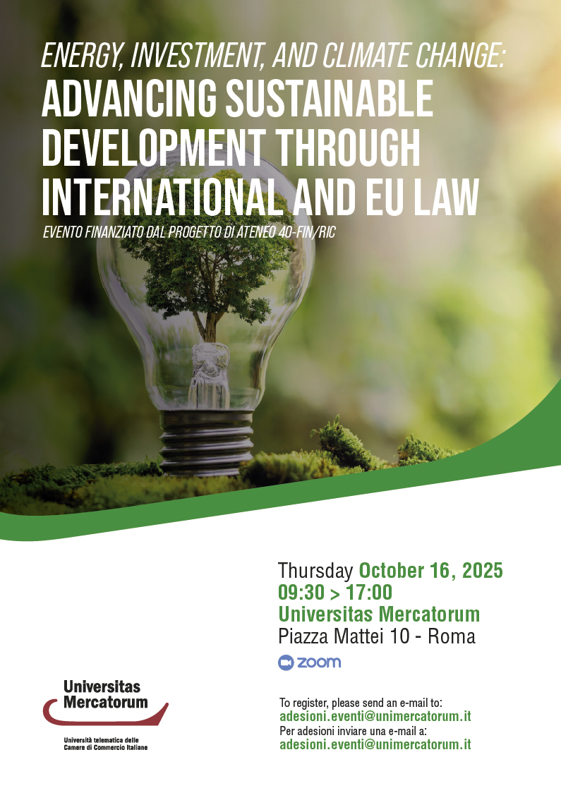 Giovedì 16 ottobre, dalle ore 9.30, presso Universitas Mercatorum, si terrà l'evento intitolato Energy, Investment, and climate change: Advancing Sustainable development through International and law.