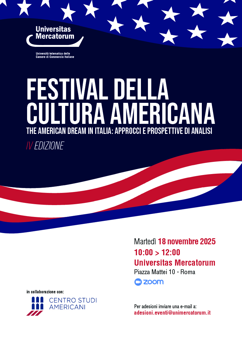 Martedì 18 novembre, dalle ore 10:00, presso Universitas Mercatorum si svolgerà l'evento intitolato "Festival della cultura americana | The American dream in Italia: approcci e prospettive di analisi".