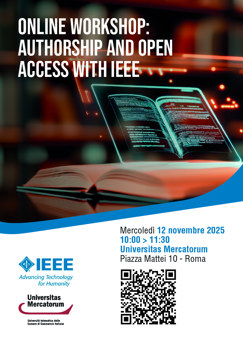 Mercoledì 12 novembre, dalle ore 10:00, presso Università Mercatorum, si terrà l'evento intitolato "Online Workshop: authorship and open access with IEEE", promosso dalla Biblioteca Digitale di Ateneo in collaborazione con IEEE Italy.