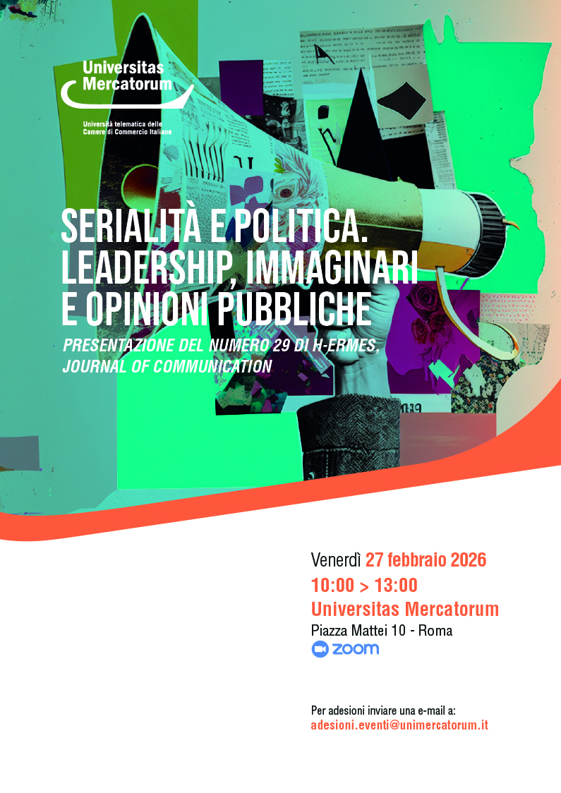 Venerdì 27 febbraio, dalle ore 10:00 alle ore 13:00, presso la Sala Convegni di Universitas Mercatorum, si terrà l'evento "Serialità e politica. Leadership, immaginari e opinioni. Presentazione del numero 29 di H-ermes, Journal of Communication".