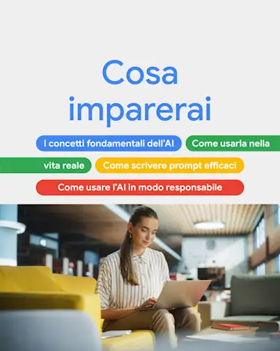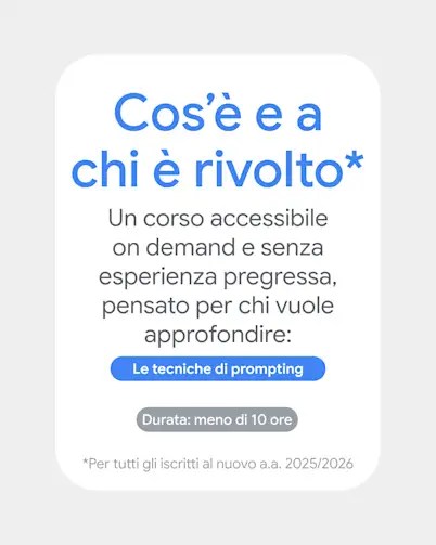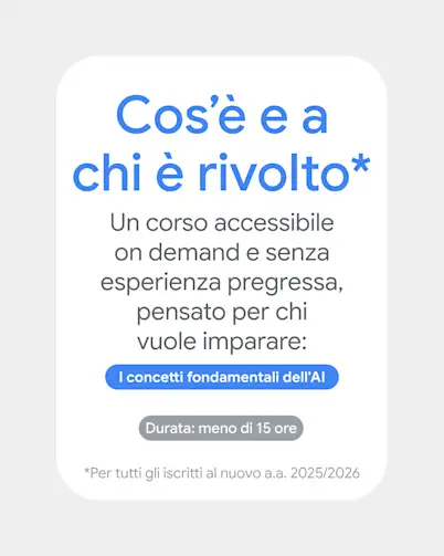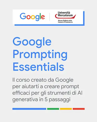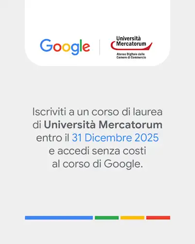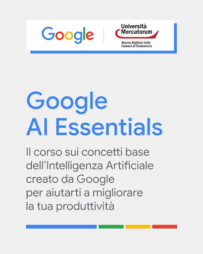 Grazie alla collaborazione tra Mercatorum e Google puoi accedere senza costi ai percorsi formativi ufficiali di Google sull'Intelligenza Artificiale, pensati per prepararti alle professioni del futuro: